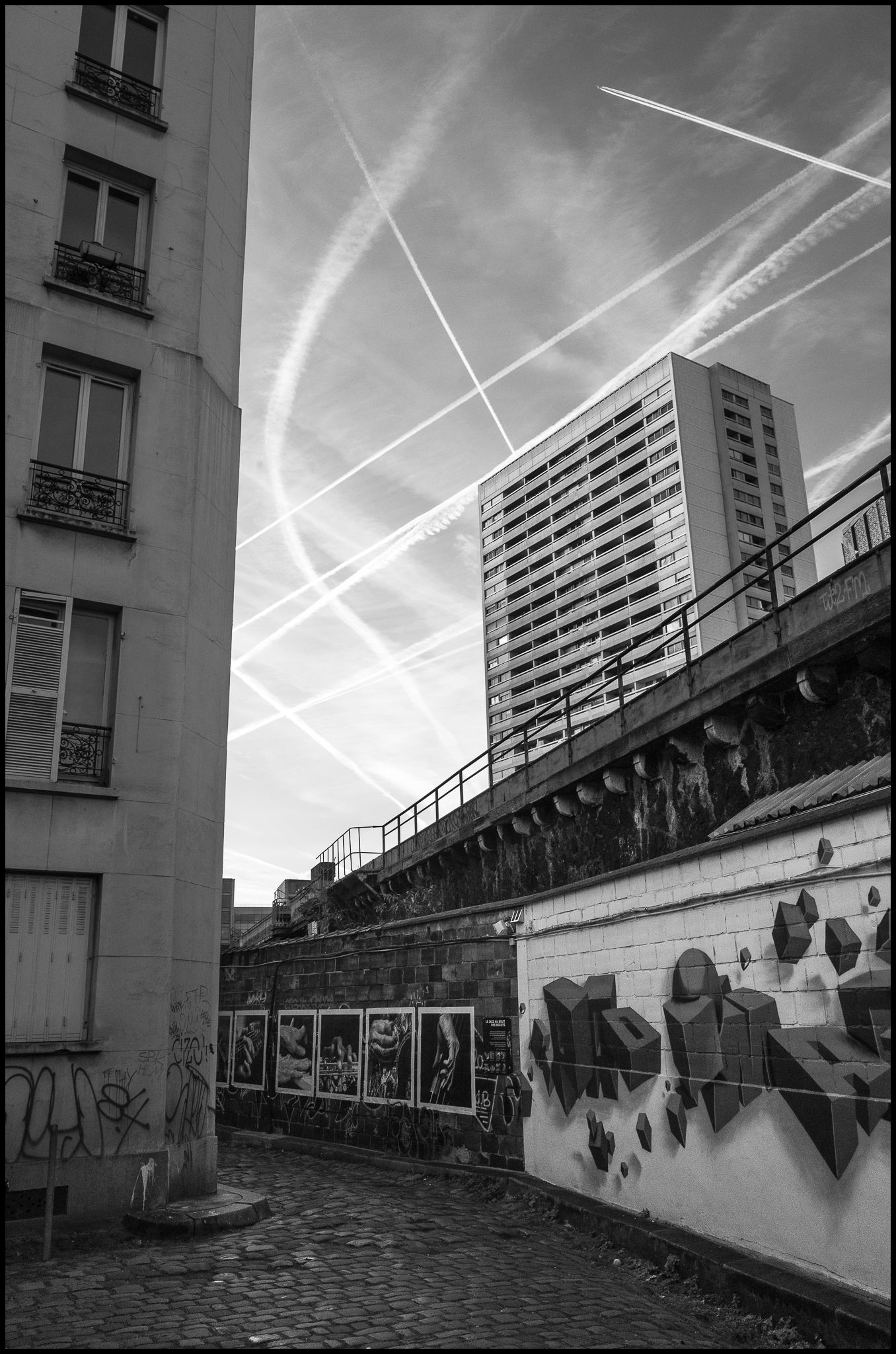 Des trainées d'avions de ligne zèbrent le ciel de Paris.